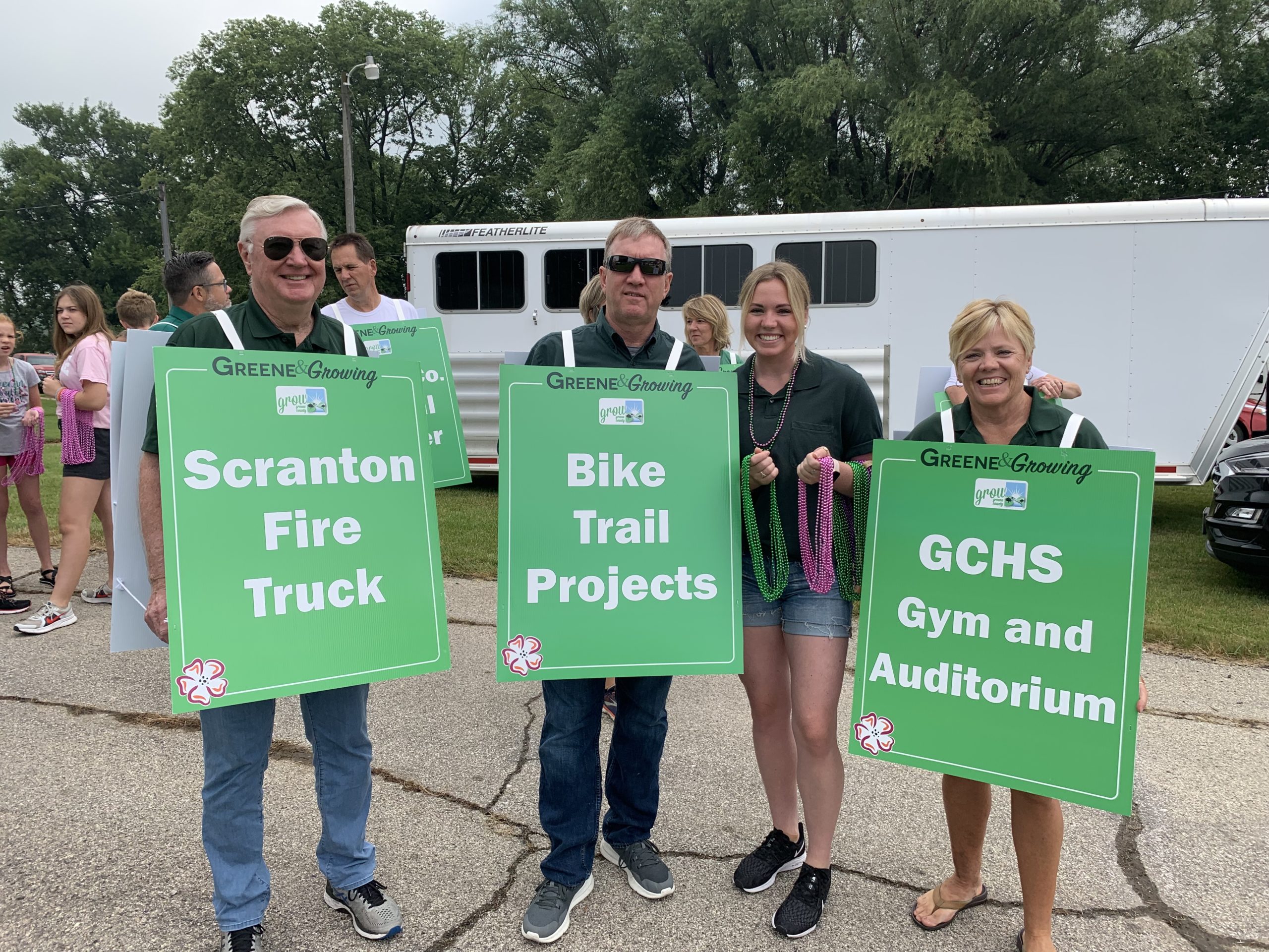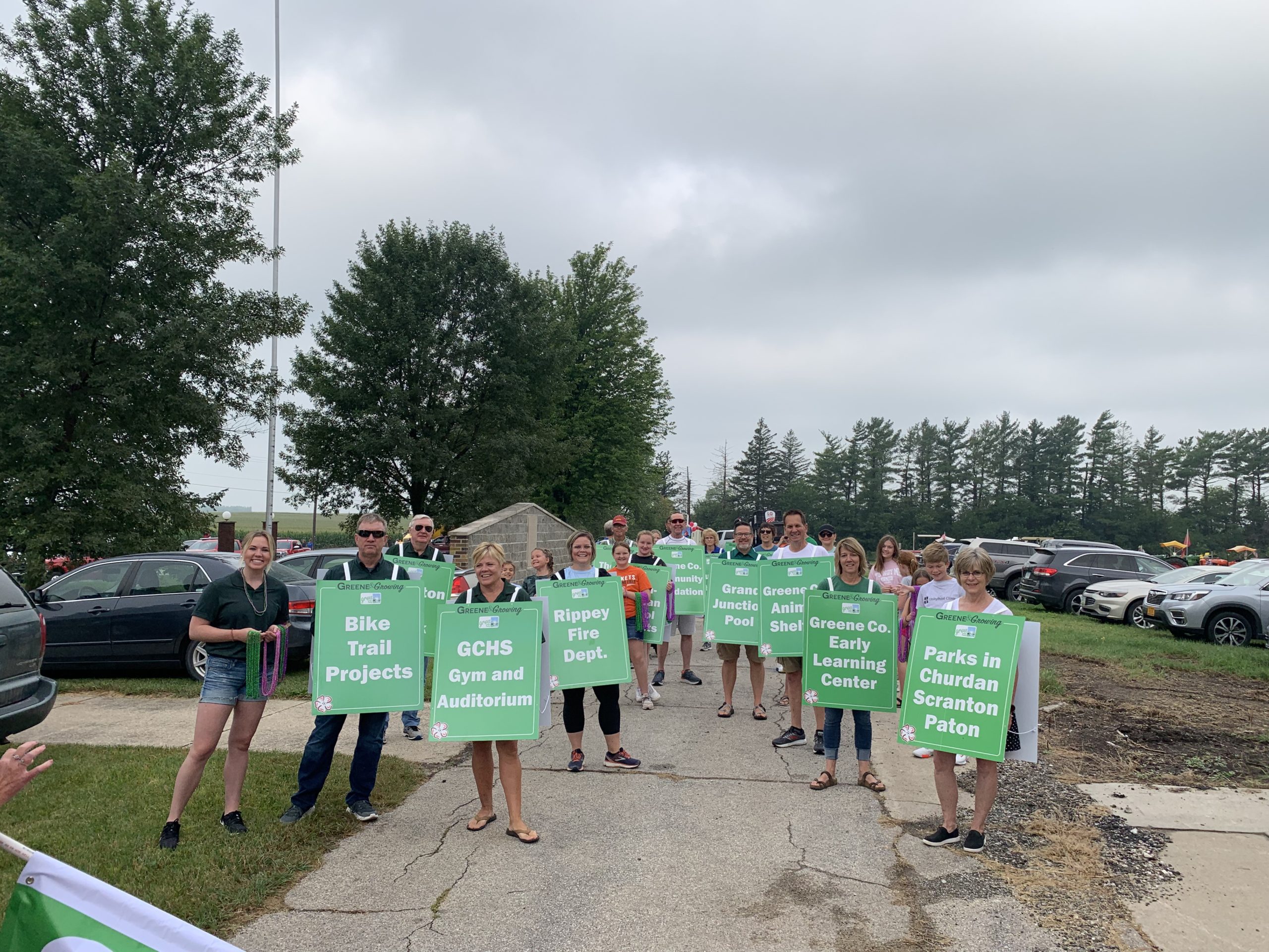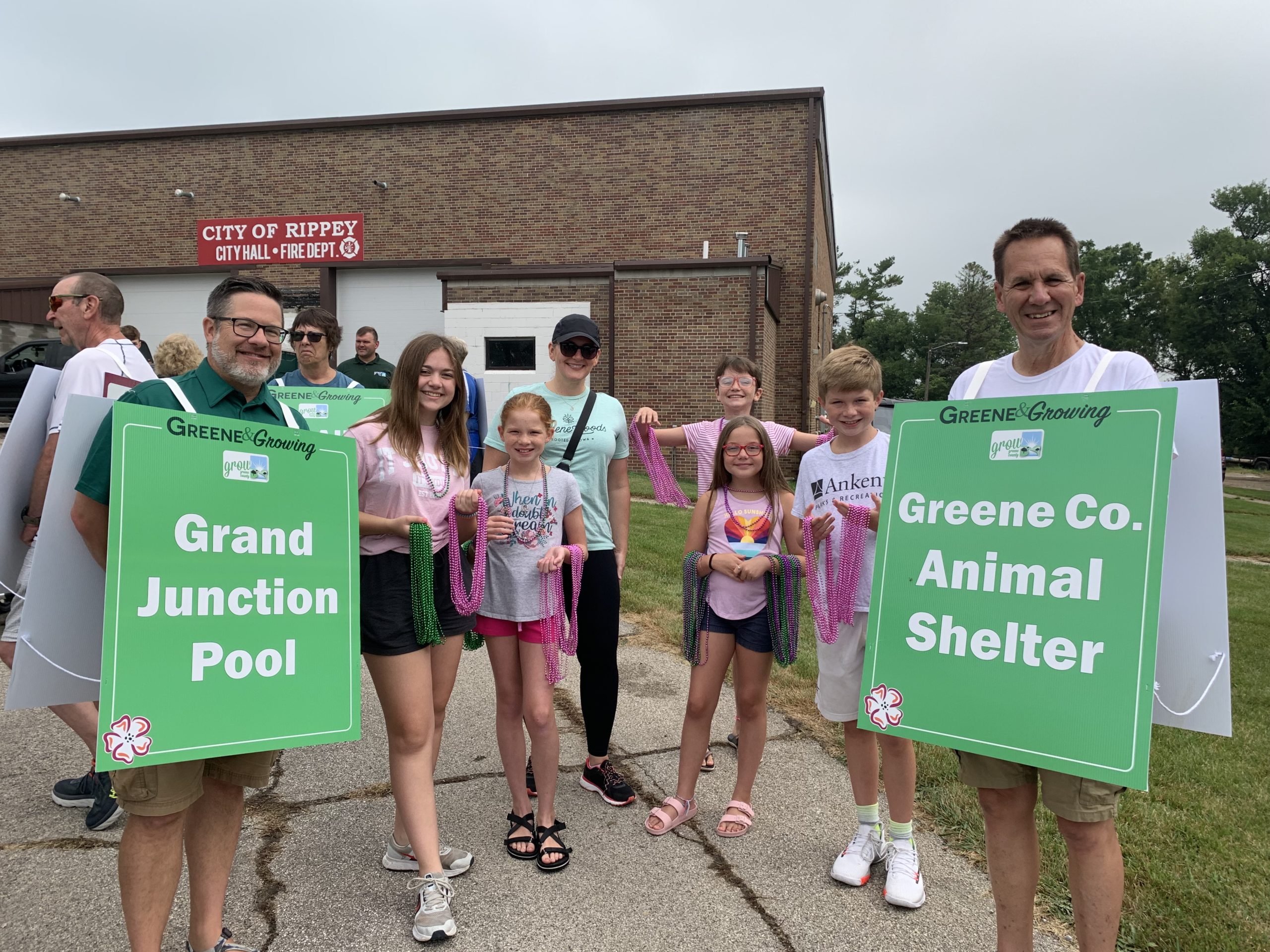Grow Greene County was excited to be a part of Rippey’s Sesquicentennial +1 Parade on Saturday, July 31. It was a beautiful day to gather volunteers involved in so many awesome projects happening around Greene County supported by funds from the Grow Greene County non-profit. Thanks to these volunteers for wearing the sandwich board signs for some of the larger projects and those who handed out the beads to the parade goers.