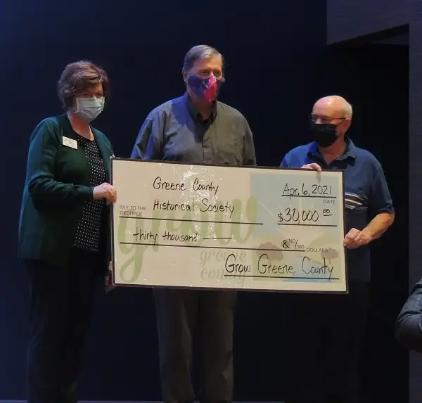 Greene County Historical Society president David John and director Roger Aegerter accepted a check from Grow Greene County board member Peg Raney.